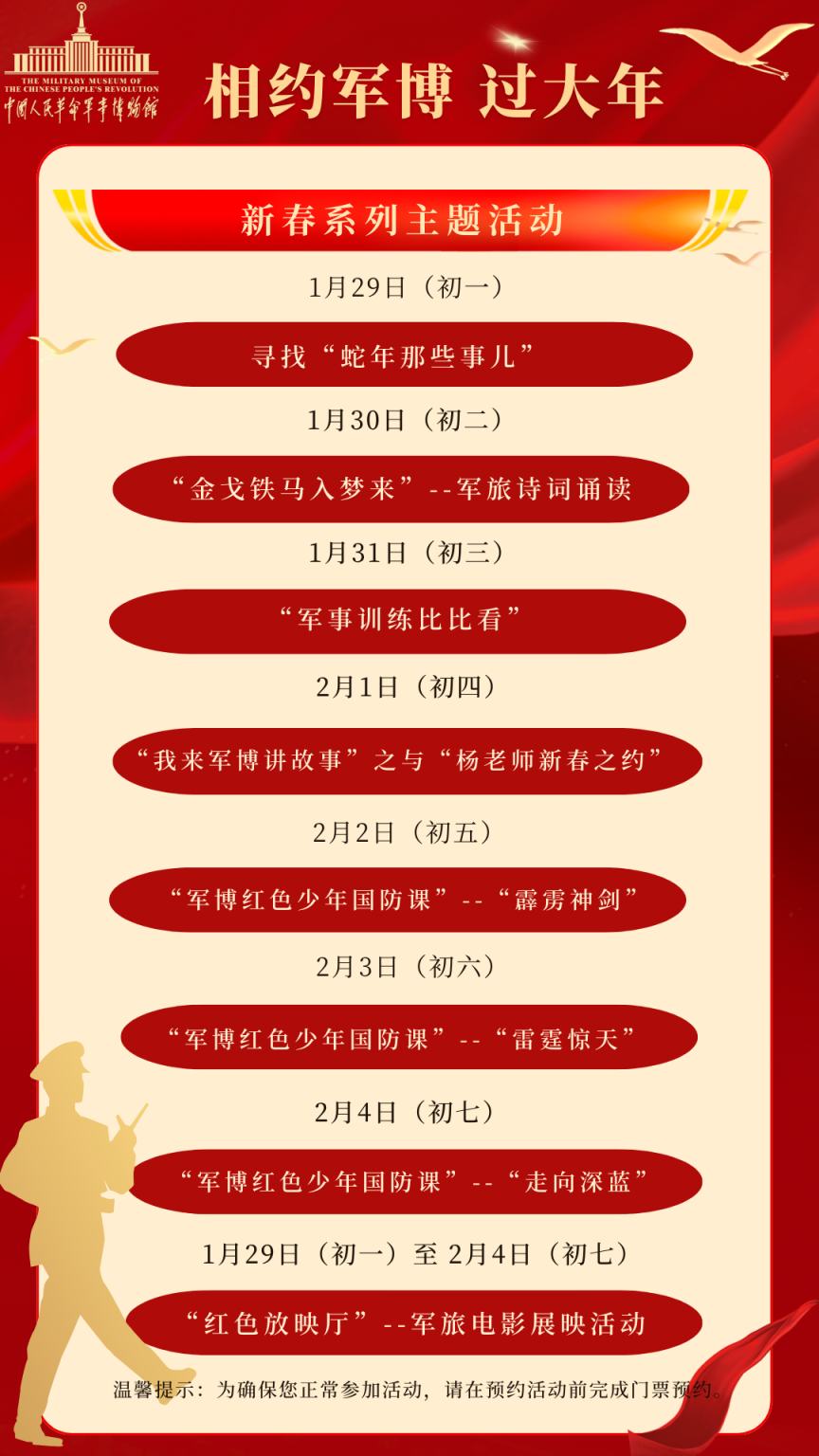 我馆继续为现役军人、军队文职人员、退役军人、持“三属”(烈士遗属、因公牺牲军人遗属、病故军人遗属)优待证人员、消防救援人员、60周岁及以上老人、残疾人提供现场预约快速入馆服务。免费提供存包、轮椅、儿童车、直饮水、自助语音导览、定时公益讲解等服务。节日期间,每天开展红色电影展映、航空航天科普讲座、军事互动项目体验,以及形式多样的社教活动。